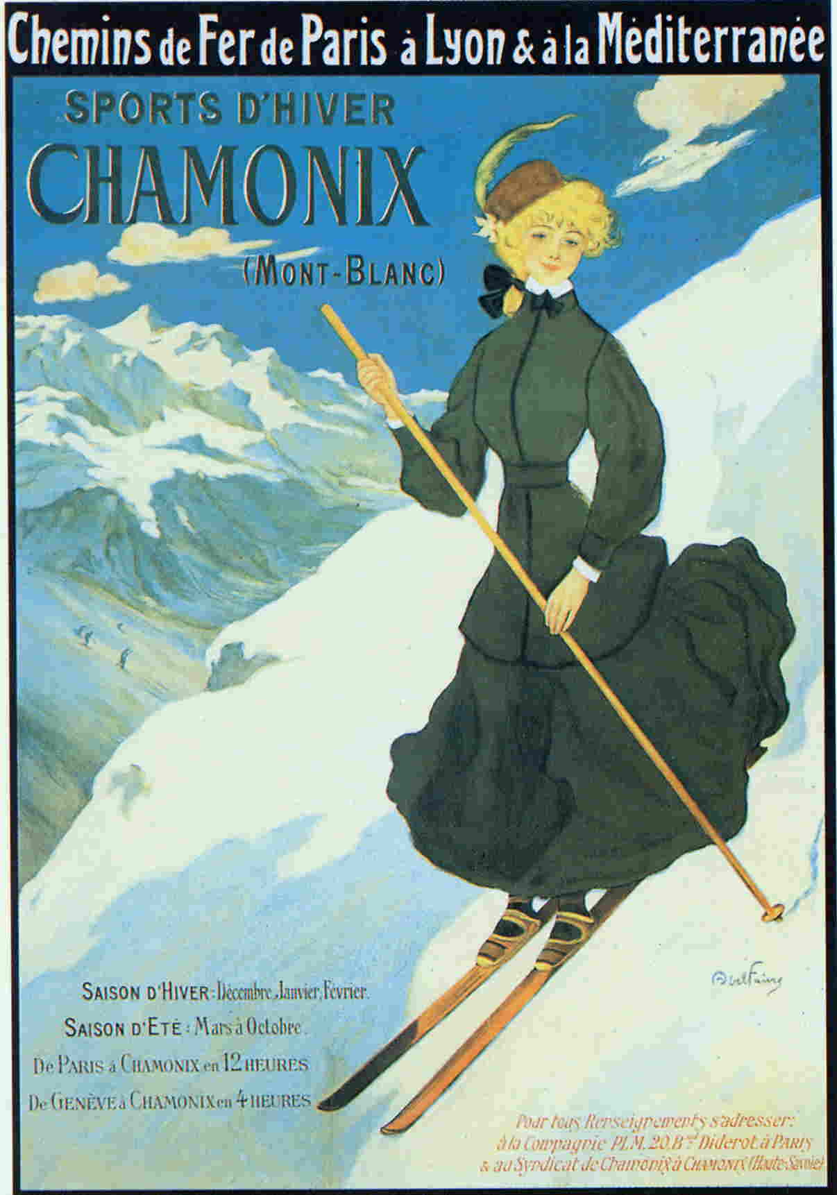 シャモニの絵葉書から。スカートをはいてのスキーは本当らしい。