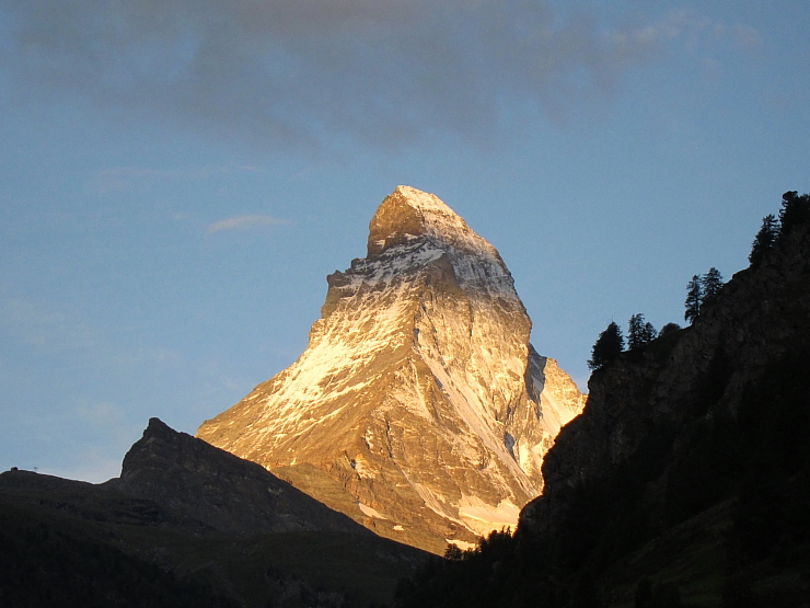 早朝、モルゲンロートに輝くマッターホルン。上空に見える雲の影が8合目あたりを暗くしてしまった。