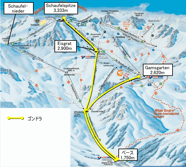 さて、到着したはいいが、氷河とはいいつつ一枚バーンではなく、とてつもなく広い。氷河地帯の山間部をスキー場にしました、という感じだ。なにしろ1500mほどの標高差を3本のゴンドラを乗り継いで最高地点(しかも、富士山の八合目よりも高い場所!)に行くのだから、普通の日本のスキー場の感覚で地図を軽く見ないほうがいいだろう。もっとも、今日は天気がよく、山の位置やゴンドラ、リフトを見れば自分がどこにいるかわかりやすいので行動はしやすい。