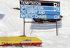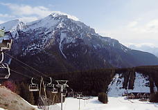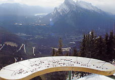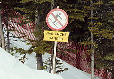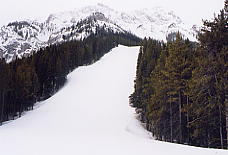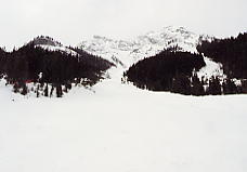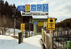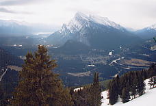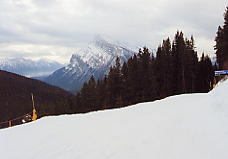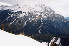 ベースから見て一番左のリフト、North Americanに乗る。ここはゲートで「このリフトはエキスパート専用だよ!」と、これでもかというくらい看板を出している。そしてこのリフトは長さ945mで396mの高度差を引き上げてくれる。高い針葉樹林の中、頭を引っ張りあげられるような感じがするほどの急勾配を上っていく。ここを乗車する客は少ないが、ランドル山が見えてくると、今日一日が有意義に感じられてくる。このランドル山はなかなか絵になる山だ。包丁で斜めにスッパリ切ったような形をしており、自然の創造物とは思えない。もし人里離れた奥地でこの山を見たら、きっと魔物か何かが棲んでいると信じるだろう。ノーケイのポスターなどで必ず出てくるのがこのランドル山だ。最高地点は2133mであるが、景色はそれ以上に感じられる。ここは展望台にもなっており、周囲の山の名前を指し示す標識があり、ランドル山をはじめバンフの街を見下ろすことができる。