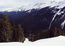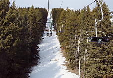 さて、リフトが動き出したが、客はまだ少ない。50人くらいだろうか。閉鎖間近のベタ雪のスキー場なのでいたしかたない。ベース部分は水が浮いているところもある。とりあえず地図の左から2つ目のクワッド1本を滑る。これはかカスケードという名のリフトで、その名の通り、ここからはカスケード山(カスケードとは小さな滝のことで、岩山からちょろちょろ水が流れているらしい)を真正面にして滑ることができる。上部はそこそこの雪だが、ベースあたりで一気に融けている。
