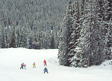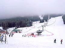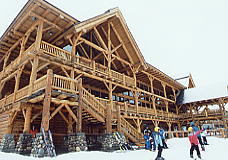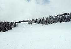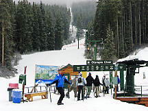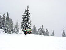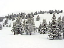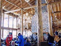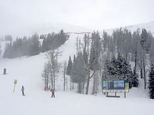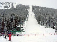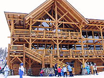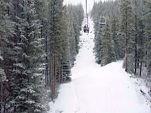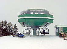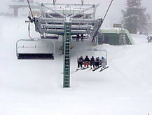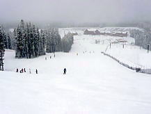 とりあえずセンターハウスでトイレその他を済ませる。ここのセンターハウスは丸太でできた実にすばらしい建物だ。火がついたら一発なので、あちこちに消化ホースがある。これといった建物はこれだけだ。ここから各方面にリフトが出ているのだが、私は景色優先で最高標高に行くため、オリンピックチェアに乗る。見事なカラマツ林の間を縫って、雲の中を登る。サンシャインの時みたいにいきなりカンカン晴れてくれないかな。降車場から少し下った所にサミット・プラッターがある。プラッターとは大皿とか円盤という意味で、股間に丸い皿の付いた棒をはさみ、登っていくものだ。1kmほどの長さがあるが、これで400mもの標高差を上るという傾斜だ。普通のTバーでは握力が持たなくなるのだろう。