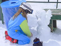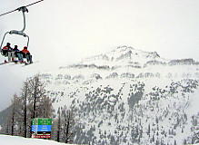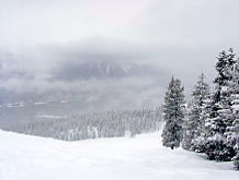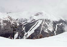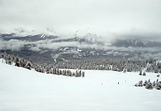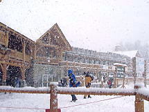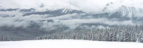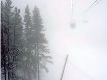 ところがこの雪、なかなか根性がある。途中から爆発的な勢いで降ってきたのだ。ううむ、いかん。外に置いた板のうえにはこんもりと雪が積もってきた。大きなホコリのようにフワフワした雪だが、見ると紛れもない粉雪だ。手で固めてもさらさらとほどけてしまう。1時間ほどで小降りになってきたので、滑ってみることにした。どうしよう、今日は早めに帰ろうか。するとオリンピックチェアを降りた所でいきない雪がやんでくれた。「トップ・オブ・ザ・ワールド」というたいそうな名前のリフトに乗ろうと滑っていたら、突然視界が開け、対岸の岩山が見え始めた。おおっ、いいぞ、信じていたぜ、さすがはレイクルイーズだ!。しかし雲がたなびき、スジ入りの景色だ。場末のストリップじゃあるまいし、シャキンと見せんかいと言いたいが、何も見えなかった朝と比較すれば大進歩だ。午後はもっと良くなることを期待し、ランチにした。
