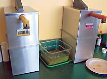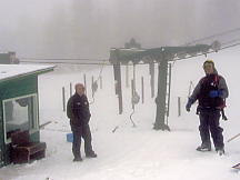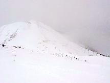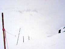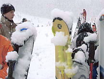 トロトロと上る。ガスはおさまるどころか、ますますひどくなる。降車駅はほとんどホワイトアウトした状態だ。ううむ。バックボウルは進入禁止のロープが張られている。そうだろう、これでボウルに入るのは富士の樹海に入るようなものだ。遠くの景色どころか、足元すらおぼつかない。こういう時は下の林間コースの方がいいので、降りることにした。「ガリッ」思いっきりいやな音がする。ゲゲゲゲッ、今の感触は岩を踏んだか?!?。恐る恐る板の裏を見てみると、キャーッ、彫刻刀で彫り込んだような線が!!。山頂付近は強風か急傾斜のため、雪付が悪い場所は岩が出ているのだ。いかん、ナビゲーターのあるコースに戻るんだ。戻ろうとして「ガリッ」もう、板を外して歩いてしまった。今まで砂も踏んだことのないケガレなき9DOがズタズタだ。コースに戻り、圧雪されたところを滑る。すると雪が降ってきた。あまり滑らずにセンターハウスに戻る。コーヒーを飲んでHP用の原稿でも書いて、それから滑ろうかという計画であった。