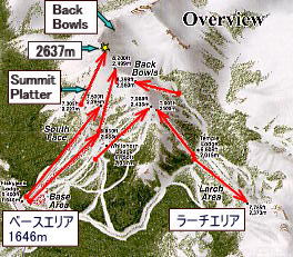 左下のベースエリアからリフトとサミット・プラッター(円盤のバー)で最高地点2637mに到達する。