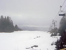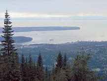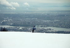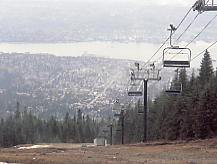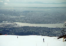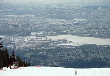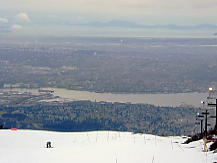 すこし時間をつぶしてからいよいよThe Cut というナイターコースへ。しかしガスは晴れていない。コース脇には巨大な木の彫刻が並んでおり、ちょっとしたパークだが、それが逆に廃墟のようなむなしさを感じさせた。ところが、The Cut の先に晴れ間が見えて、バンクーバーの市が垣間見えるではないか。たのむ、晴れてくれ。ここをゆっくりとすべり降りた。春の雪だが圧雪を毎日していて、今日はスキーヤーが少ないためか、バーンはほとんど荒れていなかった。クワッドでコース沿いを上る。ふと振り向くと、急にガスが晴れだした。おおお、すばらしい!。夢中で写真を撮ったが、夜景ではない。時刻は夜の7時を回っていたが、ここは8時でもまだ明るいのだ。ううむ、なんとか夜まで持ってくれ。