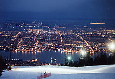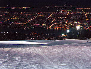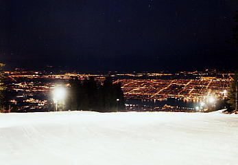 いいかげん暗くなってきたので、シャレーにいく。レストラン脇にあるテラスからバンクーバーがきれいだ。街のネオンのひとつひとつが輝き出し、いよいよ空は暗くなってきた。スキー場はどうなっているだろう。8時過ぎにはナイターが終了したので、板を履かずにストックだけ持って、歩いて The Cut のコース上部へ向かった。