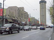 成田帰国組や他の都市に行く人とは別れて、観光組は市の中心部にあるJTBオフィスに案内される。ここで少し説明を受け、ホテルの位置を教えてもらうと近くのお土産屋に連れて行かれ、そこで解散となる。私はエンパイヤー・ランドマークホテルに直行し、スキーの用意をした。ホテルの窓からはバンクーバーを囲む山々が見える。山の上部は完全に雲に覆われ、天気は今にも降り出しそうだ。私はすぐにスキーに出動できるようにウェアや道具をホテルの部屋の床に並べておき、とりあえず市内観光に出て、ナイターに賭けることにした。ホテルを出たところで雨が降り出した。一応傘は持っていたが、ザックを背負った肩が重くなった。市の中央部のコーヒーハウスで昼食をとると、海岸へ向かう。パンパシフィックホテルのところで曲がり、数年前にも立ち寄ったガスタウン(数少ない、史跡と呼べる場所)に行った。天気は降ったり止んだりだ。そこから前回は行かなかったチャイナタウンへ行き、中山公園を見てから市の中心部へ向かう。ここで雨が強く降り出し、ビルの中の喫茶店で休憩した。