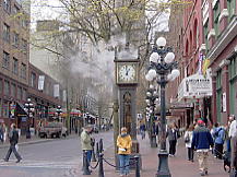 ガスタウンへの道はお土産屋が並んでおり、中国人が経営しているものも多い。バンクーバーというよりも、カナダ全体のお土産を扱っている印象がある。すると少し坂を下がったところ、道路の左側に蒸気を噴出した時計が見える。これは15分おきに蒸気で音楽を奏で、1時間ごとに強く蒸気を噴出する。途中の土産物屋で時間調整しながらその時刻に合わせて訪れたい。