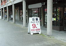 さて、ここからペンダー通り(Pender St.)を西へ進む。ハウ通り(Howe St.)との交差点を左折(地図では下へ)する。すると3区画ほどでロブソンスクエアに到着する。ここの角にはシアーズがあり、中を見てみるのもいい。ここはロブソン通りとの交差点だ。このロブソン通りを西(地図では左)へ行く。ここはお土産というよりも普通のショッピング街なのだが、忘れてならないことは、日本料理、中華料理の店が多いことだ(基本的にこの辺では日本人の女の子の旅行客を実によく目にする)。チャイナタウンには実は観光客が入れそうな中華料理店は少ないのだ。だから、到着したばかりで時差ボケで疲れた胃にはここでお粥がいいだろう。これから帰る人でも、ここでうどんでも食べてみるといい。私はひさしぶりにここで肉うどんを食べた。$4.95、きつねうどんも同じ。ごはん、味噌汁はそれぞれ$0.95だった。店員はほとんど日本人の女の子のバイトだ。それに対して空港の日本食レストラン(HANAMIという)はあきれるほど高くてまずい。下に写真があるので見てほしい。昨夜の久しぶりのうどんに感動して海鮮うどんを注文したが、麺は見た目通りコシがなく、駅の立ち食いに負けておる。唖然として、料金をメモるのを忘れたが、確か日本円で1000円を超えていたと思う。