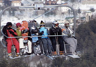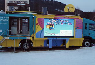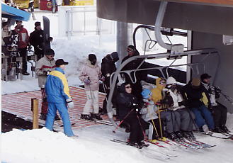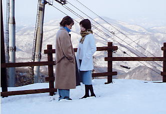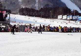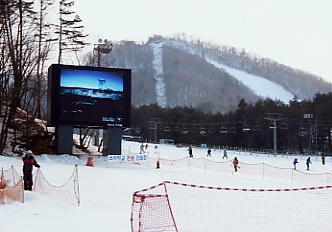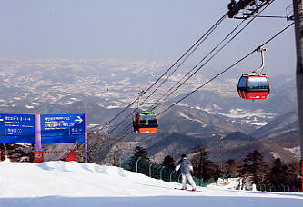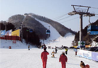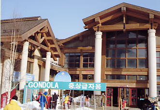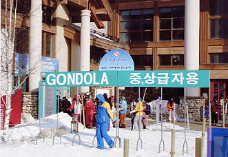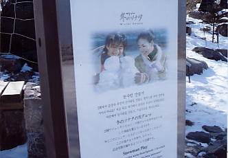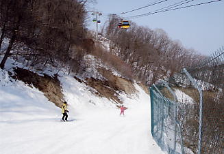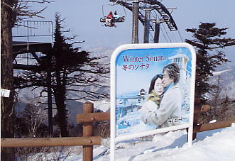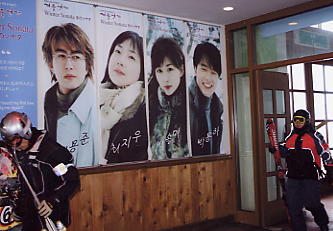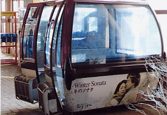 厳重に防寒の準備をしていよいよゲレンデへ。ゴンドラ駅舎はちょっと歩いたゲレンデの端にある。見るとなかなか立派な建物で、ドラゴンプラザというサービス施設が併設されている。 ところでこのゴンドラ駅内部にはゴンドラの車両が展示してある。そう、冬ソナの記念としてだ。ドラマの中で2人が乗った番号のゴンドラ(往復で2両)は観光客がそれに乗ろうとケンカになるので、外して展示しているという。ううむ、ケンカしているところを見てみたかった。 ゴンドラは5分待ちくらいだった。ゴンドラコースは初級者コースが無いので、初級者比率が高い韓国においては乗ることができるのは少数派なのだ(初級者用に下山コースはあるが)。このゴンドラで一気に山頂へ行く。同乗者の韓国語の会話は何を言っているか分からないが、ちょっとウキウキした感じは伝わってくるものだ。 さて、ゴンドラを降りてみるとそこは明るく遠くまで見渡せるいい天気だったのだが、どえらい寒い。写真を撮ろうと手袋を外すと、風が強いせいもあって、長くは出していられない。天気がいいし周囲の山々は雪が積もっているわけではないので春スキーの雰囲気なのだが、とにかく寒い。インナー手袋でも買っておけばよかったか。 さらに山頂での出迎えがアレだ。アレといえばそう、ヨン様とチェジウの看板、パネル、何でもありだ。私はそんな看板類よりも、そういう看板類にむらがる集団の方がどこか病的というか宗教的というか面白く見えたが、それにしてもドラマがここまで影響力を持つとは、驚くばかりだ。なにしろ山頂からの景色は絵になるものは何も無いくて寒いのに、ここまでスキー板を履かずに団体で登ってくるのはもう、病気軍団しかいないのだ(むこうから見れば、韓国へスキーに来る私は病気だろうが)。 まあお金を払って好きで来ているんだからいいか。ちょいと準備運動をして、いよいよ滑ることにする!!。 |