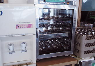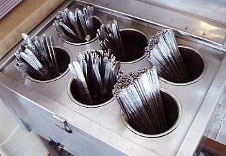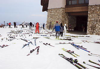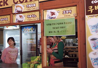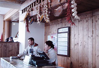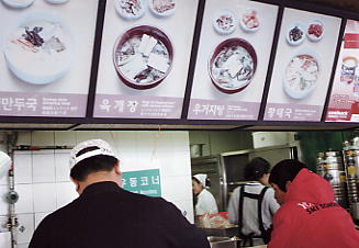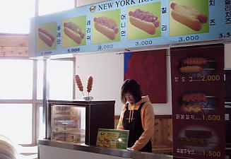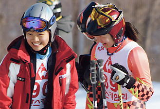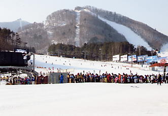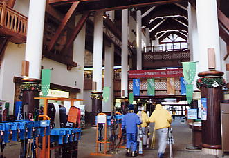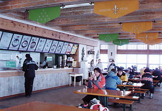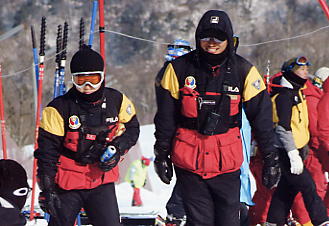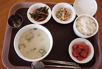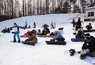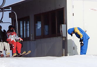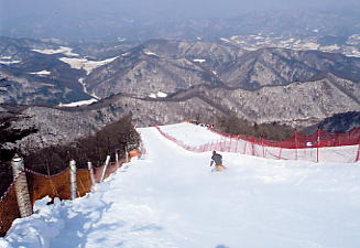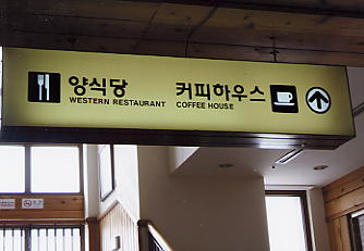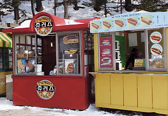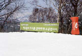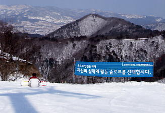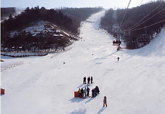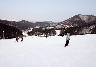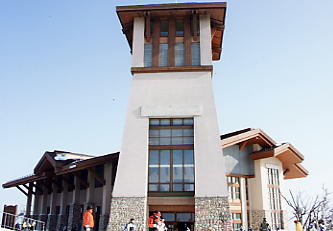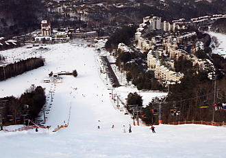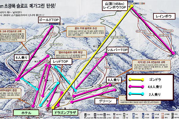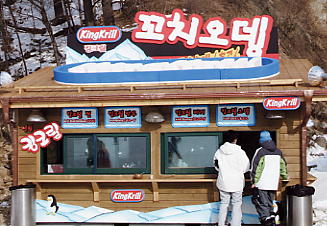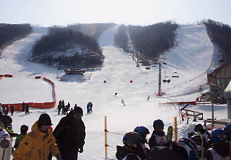 レインボウのコースはどれも圧雪された急斜面で、本来ならコブになる斜度だが、雪が固くて圧雪しているのでまさにレーサー向きの「強い」バーンだ。雪はいったん融けてはいないから、アイスバーンにはなっていなく、ストックを強めに刺せば刺さるくらいだ。ここにはワールドカップを開催した時のスタート小屋がそのまま残っていて、レース専用で貸切になっていたコースもあった。どれどれ、ちょいとレースを見てみるかい。するとどうも中高生くらいの女子のトレーニングのようだ。韓国の女の子の顔は一重でちょっとつり上がり気味で、根性がありそうで、スポーツに向いた感じだ。会話を聞いてみても「なんとかかんとかダ!」と断定的な表現の語尾は意志の強さの表れとも感じられる。これがまた弾丸のようにすっ飛んでいくのだから、やはり気合いがあるのだろう。技術的にはまだまだだが、少ないスキー人口でスキーレースができる所得階層がまだ限られていることを考えると「これから」ということだろうか。 このレインボウのコースはどれもレース向きで、だまっているとグングンスピードが出る。しかもコースが独立していて一般客の流入がないので貸切にしやすい。レーサーにはとてもいい環境だろう。とりあえずここを一通り滑ることにした。そこで気づいたことがいくつか。 リフトに乗っていると、ときどきオープンしていないコースが見られた。そこにはほとんど雪がなくて、黒々としているのだ。なんのことはない、降った雪が少ないだけのことだ。だとすると、この雪の付き具合が本来のドラゴンバレーの姿であるだろうから、このコースの雪がほとんどすべて人工雪ということになる。それにしてもザウスのような人工雪としてはかなり良質の雪だ。日本の八ヶ岳にある野辺山あたりだったら、何度も融けては固まっているのでスケートリンクのような顔が映って見えるほどのコンクリバーンになるはずだ。しかし晴天でも寒いドラゴンバレーでは散布したままの結晶が残っているようだ。固いことは固いが、ストックは楽に刺さるくらいだ。まさに山全体がザウスといえよう。 もうひとつ、リフトを降りるときに係員のにいちゃんがお辞儀をするのだ。降車する客にお辞儀をするのは日本では今シーズン復活を果たした岩手高原スキー場で見たくらいだが、ここでは両手を体の脇に置いて、まるで百貨店か高級ホテルの接客のようだ。しかしよく見ると、これはどうも接客マニュアルというよりも、長幼の序を重んじた韓国の儒教の精神が影響しているのではないかと思えた。なぜなら、リフトから降りる客が係員より若い少年ばかりだと頭を下げないし、年齢の高そうな人がいるとまるで借金を申し込んでいるかのように思いっきり頭を下げるのだ。遠くからしばらく見ていたが、ううむ、やっぱりそうだ。リフト係がフレンドリーに話しかけてくるのが普通という北米の客が見たら、さすがは礼節の国と涙したであろう。 さて、ここは昼近くまで滑りまくり、お昼は山頂のタワーにあるレストランで食事をすることにした。ここの駅舎はまるで巨大な砦のようなデザインで、用がなくても入りたくなるような建物だ。 しかし、内部は冬ソナでも最も重要な撮影現場ということで、それはもう大変な騒ぎだ。ゲレ食は2階にあった。中を見たが、メニューなんぞ分かるわけが無い。見本に番号ば振ってあればいいのだが、それもない。ううむ、思い切って「クッパ」とか「ビビンバ」とか言えば通じるかな。でも、「何のクッパですか」とか言われたら、笑うしかない。するとレジ係の背景の看板に英語メニューがあったので、とりあえず適当なのを指差して頼んだ。 ハズレであった。牛肉スープのようだが、あまりおいしくない。どうも味が薄い。塩かなにか自分で加えるのだろうか。よく分からないので、とりあえず流し込んだ。料金は1000円くらいだった。まあ、しかたないか。翌日のレポで話すが、ゴンドラの下の駅舎であるドラゴンプラザの方がお勧めだ。 ここで食事の注意だが、スプーンやはしはすべて金属製だ。これは資源保護のためという意味があるらしい。紙コップもダメなので、金属のコップが使用される。また、つまようじは緑色のプラスチックのようなものでできている。これは実はデンプンでできているのだ。残飯を処理するときは豚のえさにするのだが、つまようじが入っていたりすると豚が腹を壊すので、胃の中で分解するようにデンプンで作っているらしい。なるほど。 食事の後はゆったりとした下山道を滑る。そしてグリーンと呼ばれるエリアへ。ここは初心者向けの広いコースなのだが、ここはなかなか混雑していた。また、ここには6人乗りのリフトがある。ローディングカーペット付きだ。広々としていてなかなか滑りやすくていい。ただし初心者がワンサカいるので、衝突は注意だ。 そして今日は時間がないのですぐにレッドと呼ばれるゾーンで