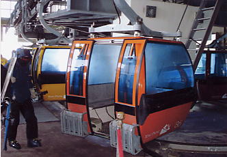 | 春スキーのような風景に カラフルなゴンドラが映える |