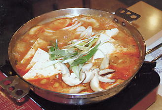 ホテルの夕食はチゲ鍋。これは4人前。 1000円ランチ程度だ。しかも辛いのに弱い人は 全然食べることができないほど辛かった。 |
