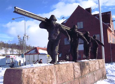 | 道路には、鉄鉱石のトロッコを 運ぶ労働者のオブジェだ |