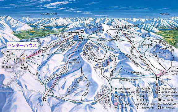 さて、いよいよカドローナだ。ところが、猛吹雪であった。とにかく風が強い。そして、風が強いと何も見えなくなるのがニュージーランドのスキー場の特徴だ。目印になるものが無いので、吹雪かれると迷子になりかねない。こういう時は、まず、徹底的にスキー場のレイアウトをイメージとして取り込んでおくことだ。最初に一番高い所に登ってしまい、ゲレンデマップを見ながら見えないコースや隠れたバーンをイメージする。そしてどこにいても、今自分がスキー場のどこにいるのか、だいたい把握できるようにしておく。これが私の大きなスキー場でのスキー術であった。
