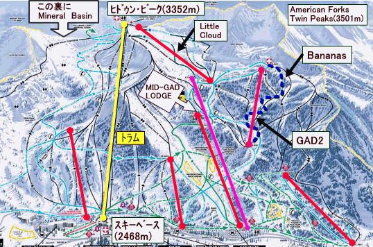| この地図はスキーベース側から見たもので、トラムで登ったヒドゥン・ピークがスキー場最高地点になります。 右側の青い点線の「Bananas」というコースでは、滑りながら撮影した動画をこのサイトでUPしていますのでご覧ください。(ソルトレイクシティのMOVIE) |