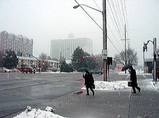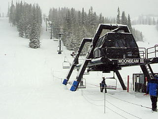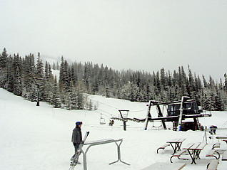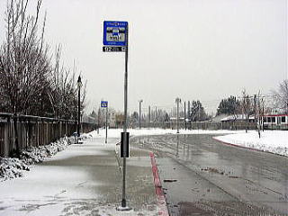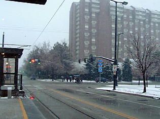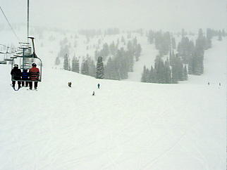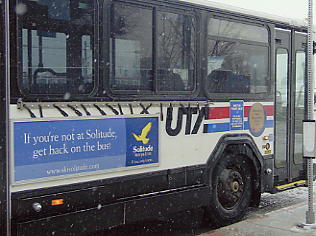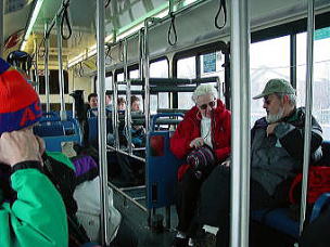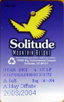いよいよ最後のスキー日となった。必修の3スキー場は無事に行けたし、アルタも良かった。最後の1ヶ所はいろいろ候補があったが、 ・リトルコットンウッドキャニオンという渓谷にあるスノーバード、アルタには行った。 パークシティ、ディアバレーのあるパークシティエリアにも行った。 3大エリアの残る1つ、ビッグコットンウッドキャニオンにはまだ行っていない。 ・実質最終日なので、夕方からは観光に行きたい。近場でそう大きくないが、 こだわりのある所に行きたい。 という理由から、ソリチュードというスキー場に行くことにした。ここはそう大きくはないが(それでも日本のスキー場と比較すると広大さを感じる)、リフト代も安く、地元の人には人気だという。前日の夕方、スキーショップで前売りの安いリフト券を買っておく。天気は危なっかしいが、私が滑っている間だけでも天気がよければいいが・・・。 翌日、起きて慄然とした。雨だ。窓の外にはまぎれもなく、雨が降っている。それも傘無しではつらそうな雨だ。ううう、どうしようか。リフト券は買っちゃったし、スキー場の天気は分からない。頭をかかえて途方に暮れてしまった。市内観光に集中した方がよかったか。テレビによると今日は一日、雨らしい。ううむ。がっくり肩を落としてしまった。しかし去年のバンフの最後、グラウスマウンテンでも起死回生の天気であったではないか。しばらく悶々としたが、やはり行くことにした。 小雨の中、板を担ぎ、ブーツの袋を持って市電の駅まで10分くらい歩く。いつにもまして重い。ここからアルタの時のようにバスステーションのある駅まで乗る。ソリチュード行きのバス停には、4、5人のスキー客がいた。いや、これでも心強いものだ。おたがい顔を見合わせて好きだねえ、と目では言っているが、バスの中にはこの団結心で雨天を乗り切ろうという気迫であふれていた(と思う)。 |