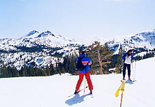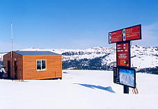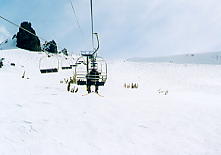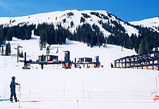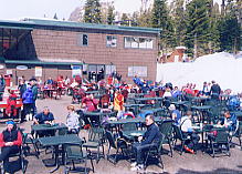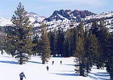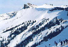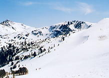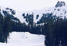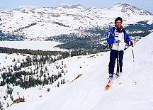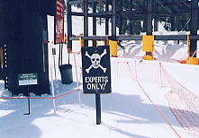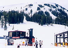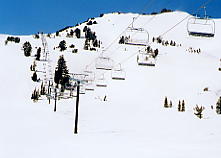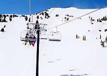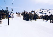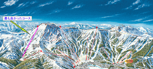 その快適バーンは圧雪もよく、見とおしがいい。上部は森林限界を超えているので障害が無くて、安心して飛ばせる。下は幅広の森林コースで緩斜面だが、勢いで速く滑ることができる。中間あたりはリフトにやや斜めに並行しているので、遠くのリフトからも丸見えだ。ウェーデルンに最適な幅広のバーンがあった。よし、日本の1級を見せてやるか。50メートルくらいをウェーデルン(アメリカ人はほとんどやらない)で滑りきると、リフトの上からストックをたたいてくれる人もいる。調子に乗って、次の1本も同じことをしたら、歓声まであがるではないか。よく見たら、村里先生とウチの女の子だ。コラ。