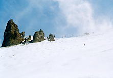 午後は最上部へ行く。大きな岩があるコースだ。コブもあるが、何とか滑った。眺めがいい。最上部の尾根は意外なほど平坦だが、後ろから吹く風がとても強くて、両手を広げると体全体が帆になり、前に進むのだ。全員で先生の後について両手を広げて進む。遠くから見たら、気違いの集団であろう。