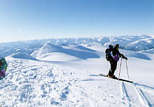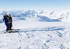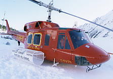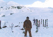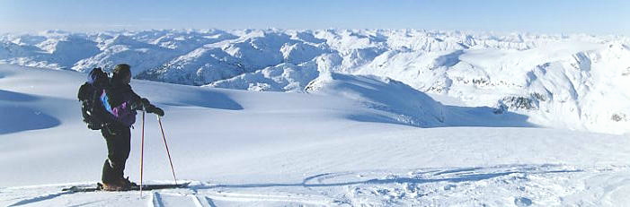 ビーコンとは、雪崩で埋まった時に電波を使って、どこの埋もれているのか探索する装置だ。埋まらなかった人はビーコンを探知にして雪面に向ければ、埋まっていてもピーピーいう。ただし、全員が雪崩に飲まれたら役に立たないが。 その他、一般的なルール(ガイドよりも先を滑ってはいけない、ガイドの指示には必ず従う、ランチは雪の上、トイレは無い(女の子は場合によっては、スコップを担いで離れた場所へ行くこともある)。野球帽は飛ばされるのでだめ、など。 班分けは自己申告だが、どのくらい(何本)滑りたいかによる。体育会系は何本も滑るが、私は5本くらいの中級クラスにしておいた。板もファットスキーを借りる。 ファットスキーとは、幅が通常の板の2倍くらいあって、短い。こんな板でアイスバーンを滑ろうものなら、角付けなどできたもんんじゃない。しかしめちゃくちゃに浮力があるので、1級が通常の板で滑るよりも3級がこの板を履いた方がパウダーの上では勝るのではないだろうか。いや、うまい下手は関係ない。とにかく楽しむのならぜひお勧めだ。なにしろ日本ではほとんど履くことなどできないのだ。 この会社は30人くらいの客が来ていたが、うまくさばいていたようだ。私は先輩と一緒に日本人の中級班になった。5人が1班になり、それに日本人ガイド(現地人で、アルバイトらしい)のおじさんと、正式のカナダ人ガイド(いろいろ入ったリュックをしょっている)、それにヘリの運ちゃんで1台のヘリに乗る。 バスでヘリの発着所へ。10分くらい山の中へ入っていく。そこで生まれて初めてヘリに乗る。ずいぶん狭い。そして猛烈な轟音(隣の人間が耳元で話しをしても聞こえない)をバリバリ立てながらヘリは上昇した。 ほどなくポイントに着いた。降りてもそのままボ〜ッと立っていてはいけない。飛び去るヘリに吹き飛ばされるので、地面にうずくまらなければならない。そしてヘリが飛び去ると、そこは静寂な世界が広がっていた。名も無いような山がどこまでも広がっていった。遠くから見てもフカフカしているのが分かる。 ここで初めてファットスキーを装着する。まるでわらじを履いている気分だ。ガイドはいきなり急坂をウェーデルンで滑る。大丈夫かな。ところがこのファットスキー、ものすごい浮遊力がある。いやあ、快適だ。幅広なのでアイスバーンの高速ターンには思いっきり向かないだろうが、パウダーでは、自分がうまくなったような感じだ。昨日のトランポリン感覚だ。いやあ、楽しい。こんな感じで感触を楽しみながらトロトロ滑っていたらヘリが先回りして待っていた。 二本目は広々とした場所へ。「ここはクレバスがあるので、絶対に私を抜かないように」ガイドに注意され、ひょこひょこ滑る。振り返るとクレバスが数箇所見える。青々とした氷が見える。これで水割りを作るとうまいらしい。ガイドはクレバスのある場所を知っているので、我々には上からは真っ白にしか見えない斜面でも、ちゃんとコースが見えているようだ。 昼食はサンドイッチとコーヒー、そしてフルーツだ。甘いお菓子が多い。軽いけど栄養がつきそうだ。他の班と合同だが、なぜかボーダーもいた。上級班にいた人はファットスキーを使用していない人が多い。ところが「しんどい」とか言う人もいた。無理せず、楽しむためにはファットスキーを利用した方がいいだろう。第一、こんな板は日本では履けないのだから。 午後は急斜面と平坦な斜面のコンビネーションだ。この平坦な斜面の下で気付いたのだが、漕がないといけない場所があった。これはボーダーにはつらいだろう。しかしボーダーにはこのような場所が無いようなコースを選んでいるようだ。スノーボードの弱点は、平坦な場所に弱いことにある。 のんびりしたヘリスキーも3時ごろに終了。エキストラでもう何本かやりたければお金を払った上で今から上級班に編入できるというが、やめておいた。 初めてのヘリスキーということもあり、実によかったが、単に浮遊感が好きだという人は、昨日の貧乏へリスキーでもOKだと思うよ。 |
