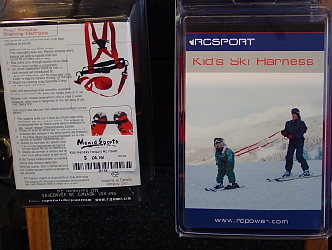 | おおっ、カナダ版巨人の星か!? なんか器具を使って子どもを鍛えているみたいだが・・・。 これはキッズ・スキー・ハーネスという、子供を練習させるための器具だ。もし親がある程度滑ることができるなら、これは結構、いいんじゃないのかな。 (ノーケイ:バンフ) |