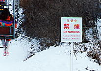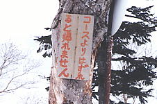 | いくぶん冷たい表現だが、まだ甘い。カナダでは、「このロープの後ろ側については、一切責任は持ちません」と、遭難事故が起こって裁判になることを前提にしたような看板もある。 志賀高原にて |