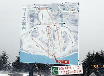 | このコース案内、実はさかさまなのだ! 確かに、山頂から滑る時は、この方が見やすい!。でも、普通のコース案内に見慣れている者にとっては・・・ ちなみに、スキー場の下では、これと同じタッチで、普通に山頂を上にして描かれたものがある(下を見よ)。 ブランシュたかやまスキー場にて |