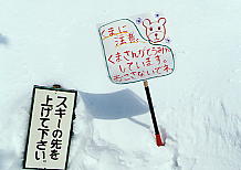 | 何かおっかないこと書いてないか? 万座スキー場の朝日山ゲレンデにて。 ゲレンデの端の方の看板だけど、すぐ近くが草津で、たまに硫黄の臭いがしてくる。まんざらハッタリではないようだ。 |
