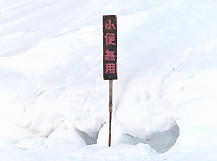 リフト降りてすぐの場所で。リフトでずっと我慢していたヤツがやるんだろうが、こんな看板出すもんだから逆に用をたされた痕が・・・ |