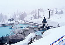 | 上の写真は氷の張ったプールだが、こちらは湯気のたつ温水プールなのだ!。 右のリフトの客は温水プールを見ながら、プールの客はスキー客を見ながら、お互いまんじりともできない緊張状態になるのだ!。 |