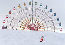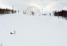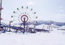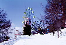 | ゲレンデがモロに遊園地と隣接しており、観覧車を眼前にしてすべることになる。ジェットコースターやフリーフォールもあるぞ!。 北海道のルスツにて。 |