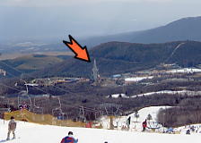 | おや、何だあれは。 イエティから見た、日本ランドの観覧車だ。矢印の所にあり、ちょうど真横から観覧車を見ていることになる。観覧車を見ながらスキーなんて、珍しいと思いきや・・・ |