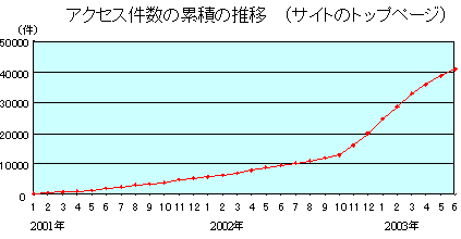 2000年12月25日にスタートして以来、ちまちまとアクセス数をかせいできましたが、2002年11月に劇的な変化が起きました。ヤフーに登録されるや(ワード検索しなくても、ヤフーの「趣味とスポーツ>スキー>体験記・レポートでたどり着くことができる)、スキーシーズンの到来とも重なり、日々のアクセスが200件を超えるようになりました。また、色々な人が見にくるようになりました。