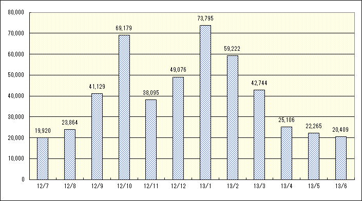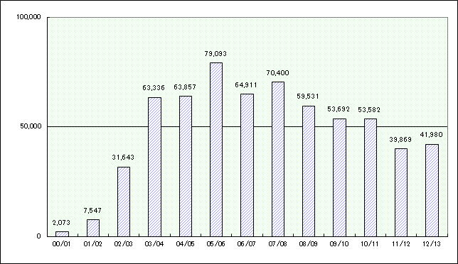 | 前シーズンは震災も影響していたのと、12/13シーズンは早い時期から雪に恵まれていたこともあり、アクセス数を戻しました。しかし、長期低迷の傾向に変わりはないですね。 | ||||||||||||||||||||||||