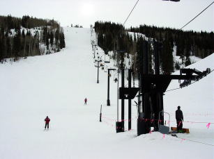 | Bald Mt.からSilver Lake Lodgeに向かって滑り降りるコースの下の部分がポールを立てたレースコースになっていて、ここではタイムトライアルもできます。 このコースは普通に滑ってしまえば非常に短いのですが、眼前の景色は高級別荘、ペンションの類がずらり、ディアバレーならではの景色です。 (2.39MB 35秒) |