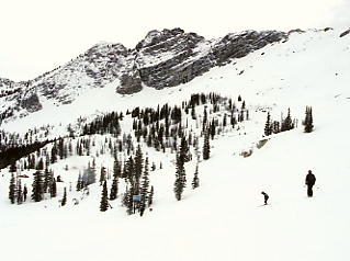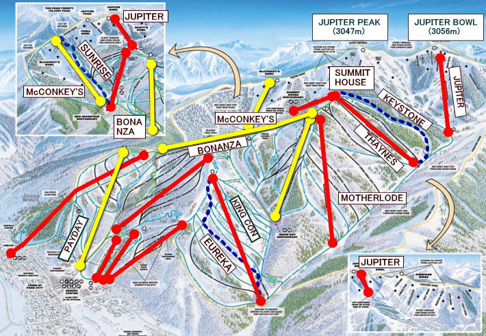 | (1)山頂のヒドゥン・ピークから裏側のMineral Basin に移動するコース Path to Paradise の滑走 |