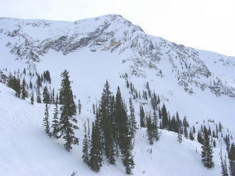スノーバードの最高地点、ヒドゥン・ピーク(3352m)から、メインとなる斜面の裏側にあたるMineral Basinというボウルに降ります。写真の地点から降りると急斜面なので、すこし奥へトラバースしてから中斜面を滑るのですが、そこにいたるまでのコースです。角を曲がると大きなとがったAmerican Twin Peaks が見えて感動します。 (2.69MB 1分10秒) |