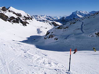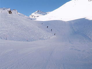 地図の上部にある、ビルクからオーバーフーベルへの谷間のコースです。谷底の部分はきれいに圧雪されているので、快適に飛ばしやすい!。画像も安定していて見やすいと思います。 最初のうち、谷間の遠くに見える山がベッターホルンです (5.25MB 1分2秒 320×240 中画面) Panasinic FX9 |