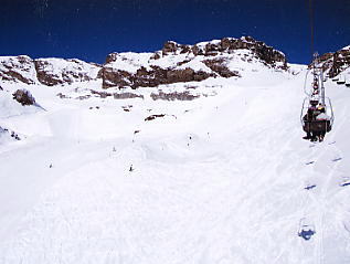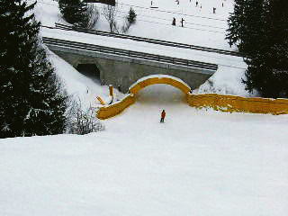 川だの谷間だのあれば、そこにはTバーなど架けられないでしょう。でもあきらめないんですね。Tバーのためなら橋を造ってしまう。日本人から見ると異様な光景ですが。 (1.8MB 21秒 320×240 中画面) Panasinic FX9 |